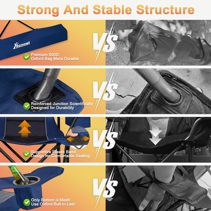 • Romswi 2PK Oversized Padded Back Camping Chairs,Heavy Duty Folding Chairs Support 500 LBS with Arm Sport, Cup Holder Cooler Bag, Collapsible Chairs for Outdoor Blue