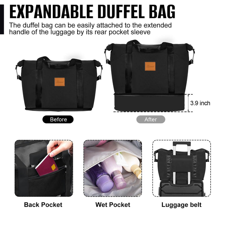 Featuring multiple compartments, compression straps, and a zippered divider, this expandable design duffel bag set offers up to 25% more packing space, keeping your essentials neatly organized and secure.