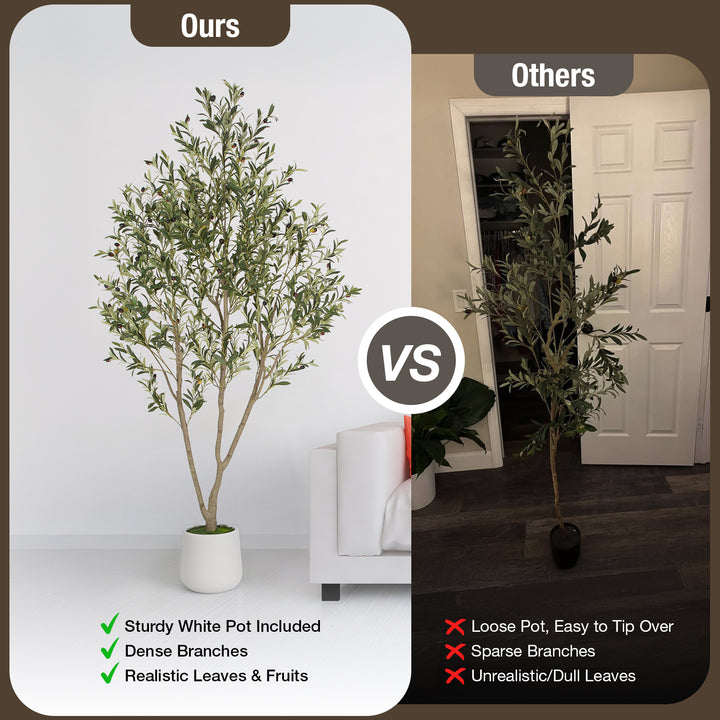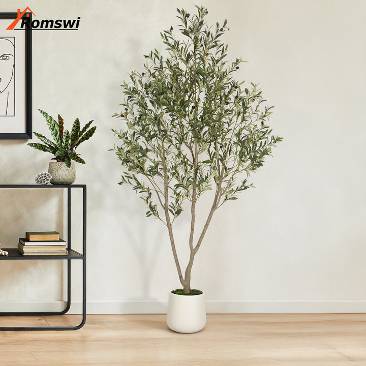 • Romswi Faux Olive Tree with Oval White Planter, 7 FT Tall Faux Olive Trees, with Natural Wood Trunk Lifelike Fruits, Fake Greenry Plant for Home Decor
