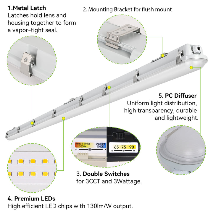 🌈 3 Selectable CCT and Wattages: Customize your lighting with ease. Our Vapor Tight Fixture offers a choice of 3000K, 4000K, or 5000K color temperatures and 65W, 75W, or 90W wattages. Enjoy soft, uniform light distribution that stands the test of time. The construction is sturdy, and you won't experience any unsightly yellowing.