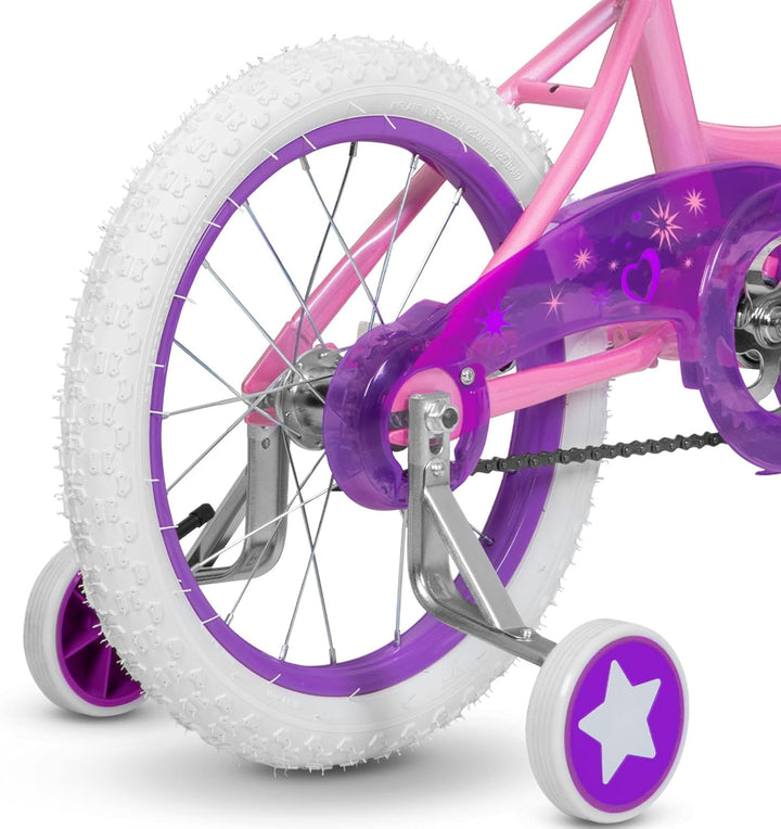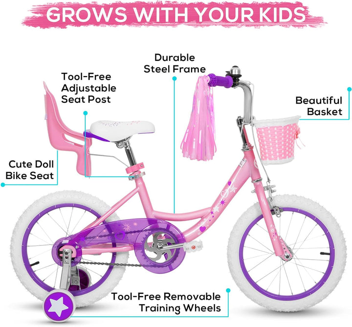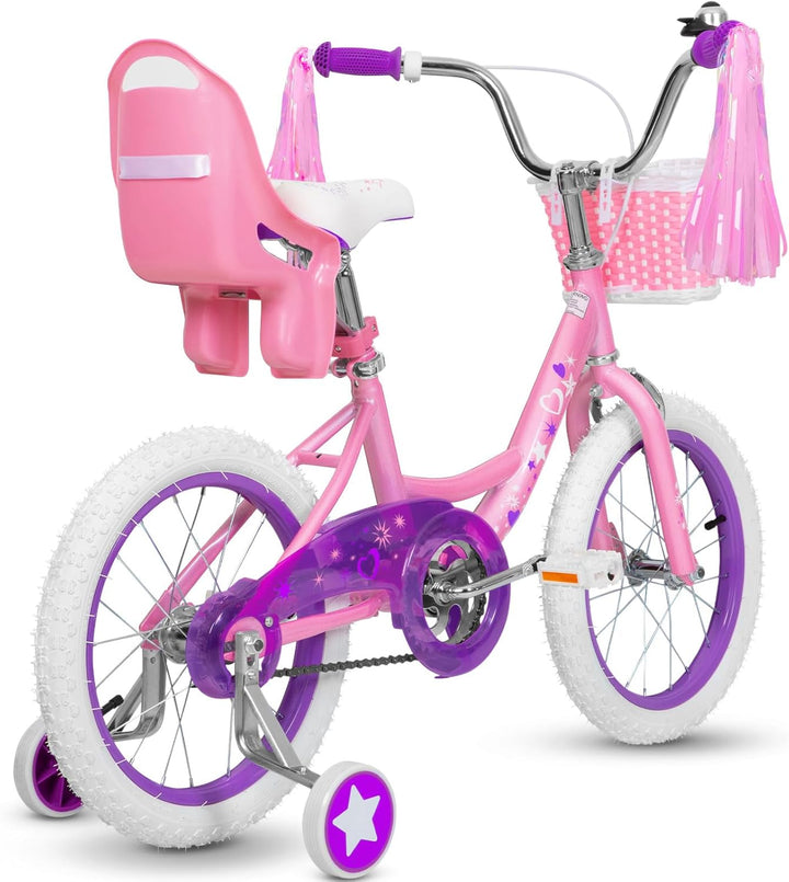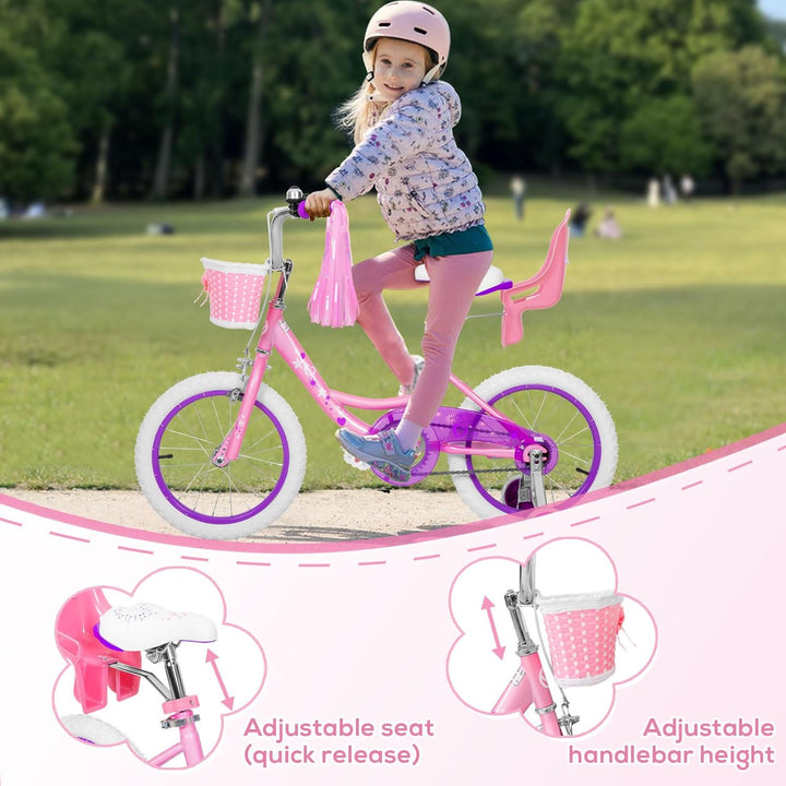 hykolity Kids Bike, 14 16 Inch Bicycle for Girls Age 3-7 with Cute Doll Seat, Training Wheel, Adjustable Saddle, Removable Basket, and Dual Brake